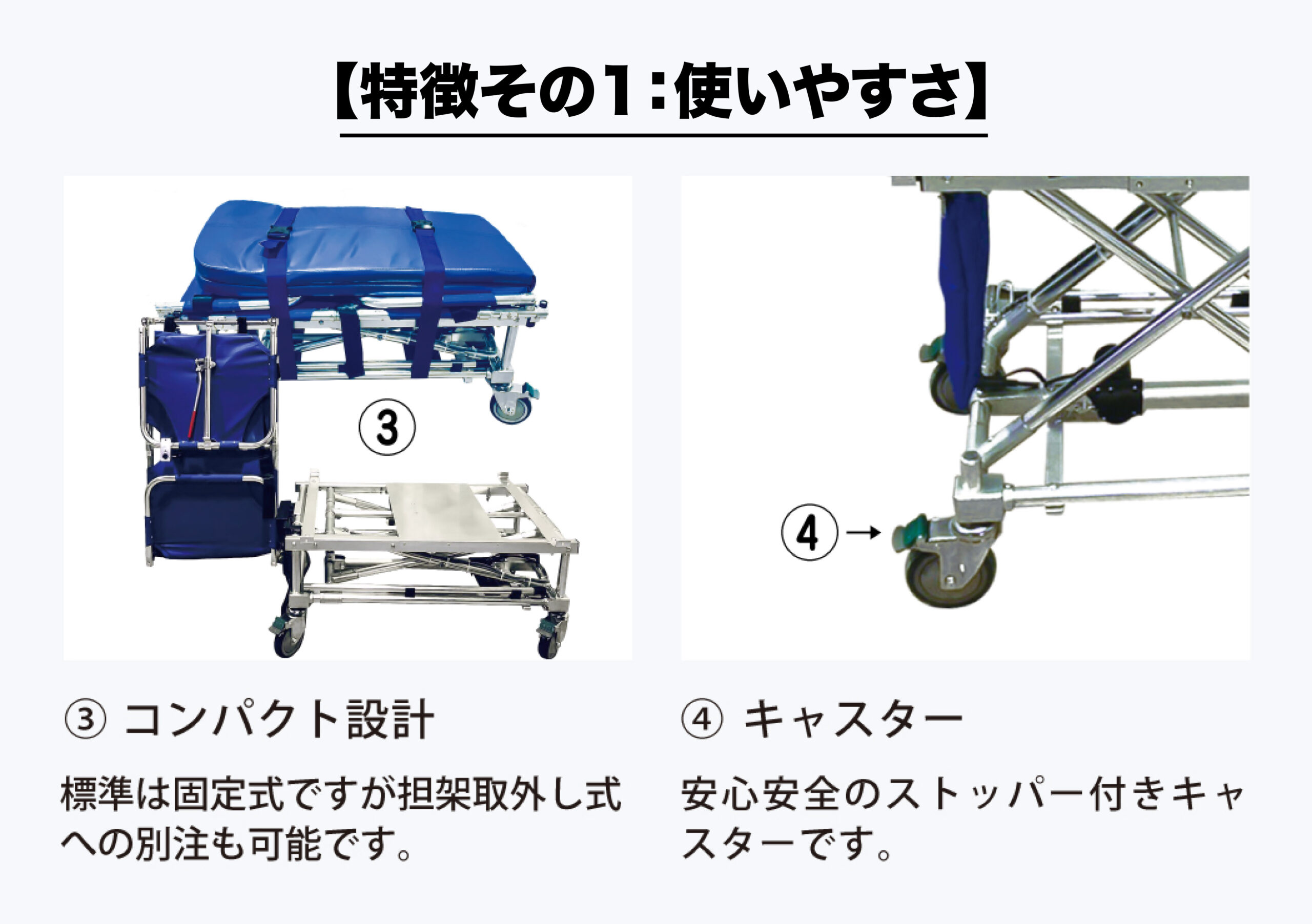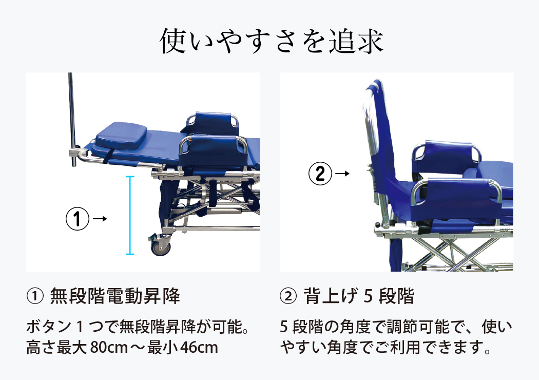 • ストレッチャーがコンパクトになるので常時車の助手席に積んで必要な時に使用さ せていただいています。 今までは必要な時に一度事務所に戻らないといけなかったので時間削減でき効率よく仕事ができるようになりました。 また電動で上下するので利用者さんも使用する私たちも大変助かっています。